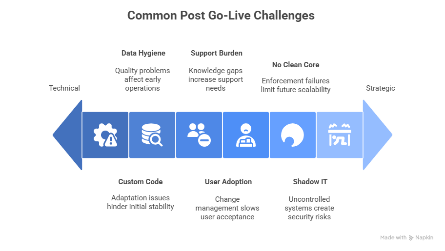 • Support burden & knowledge gaps: During implementation, a dedicated team builds and configures everything. Post go-live, many of these experts move on. If those customizations and process changes are not well documented, internal staff can struggle to maintain or troubleshoot the system.